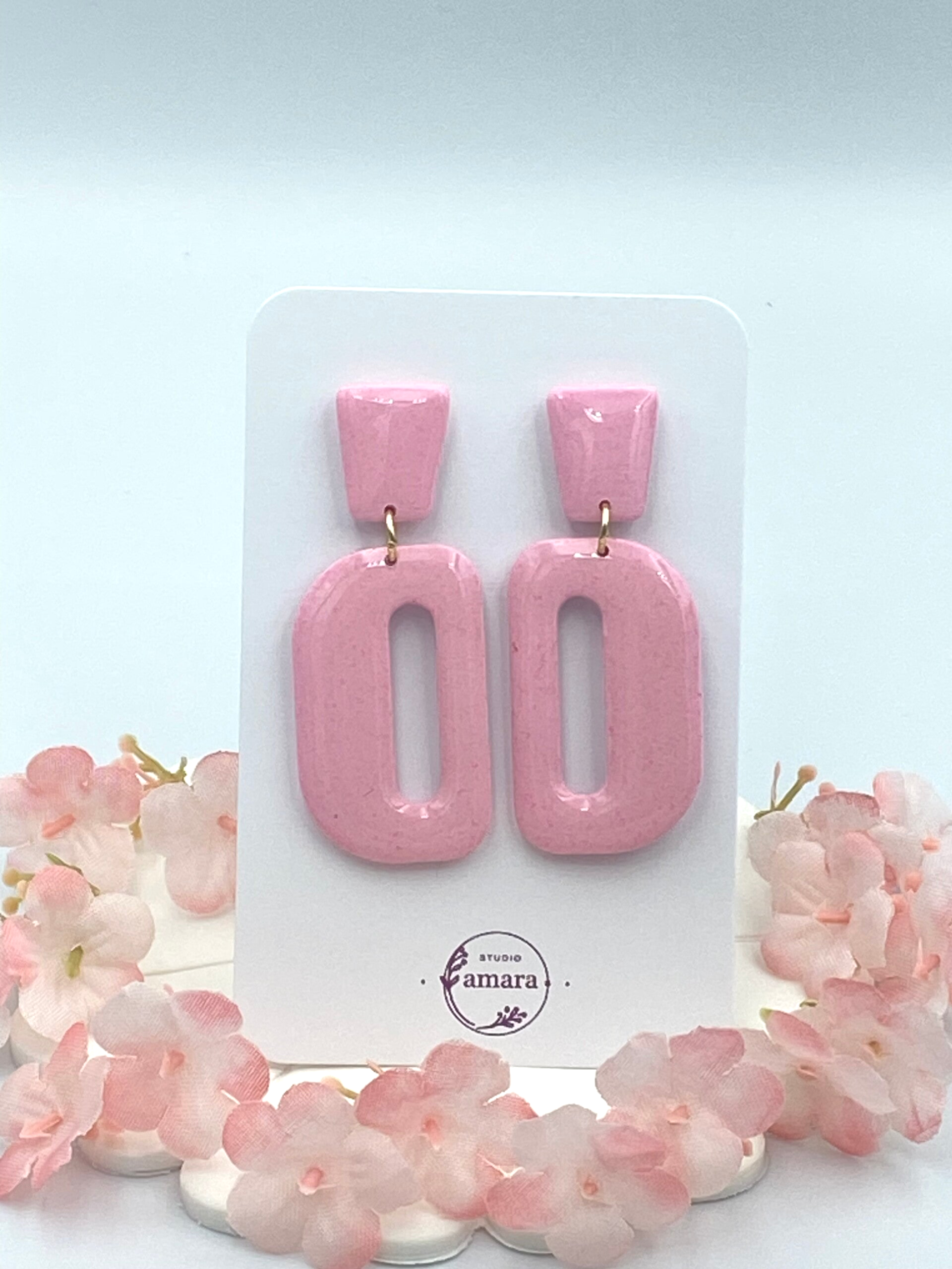 Beautiful pink earring made from polymer clay, resin on top and with stainless steal findings.