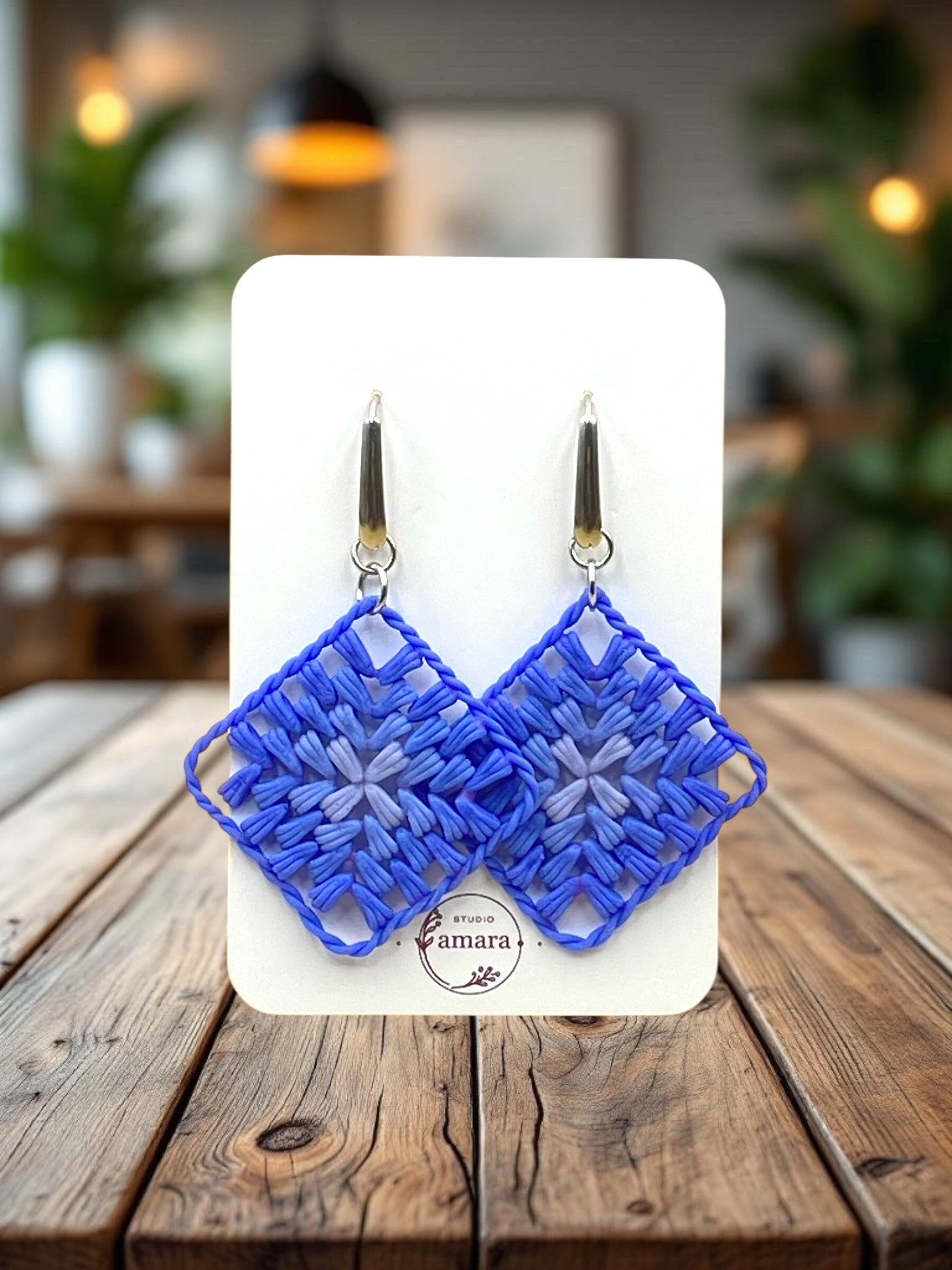 Blue granny square earrings made from polymer clay and with stainless steal gold findings.